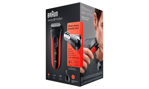 Het Braun Series 3 ProSkin oplaadbare elektrische scheerapparaat/scheersysteem biedt een snellere scheerbeurt met meer comfort voor je huid*. De 3 drukgevoelige scheerelementen passen zich aan elke gezichtscontour aan en de speciale Micro Grip pakt meer haartjes bij de eerste beweging*. *In vergelijking met de Braun Series 3. Getest op een 3-dagenbaard.
