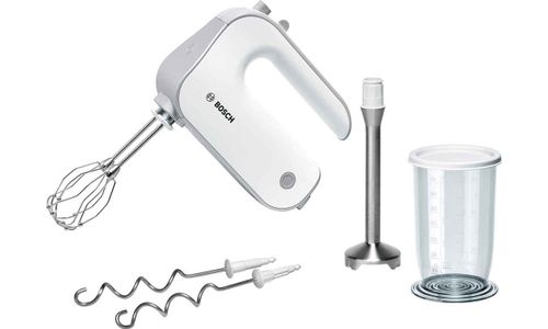 Handmixerset in het wit / zilver van 500W. Innovatieve motortechniek: krachtig, stil en licht. Ergonomisch vormgegeven “Soft-touch” kunststof behuizing. Keuze tussen 5 snelheden met verschillend toerental. Hoogwaardige inox mixervoet.