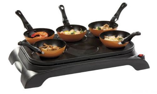Zin in een gezellig familiediner? Het kan, met deze partyset maak je zonder wachten voor ieder wat lekkers klaar, dankzij de 6 wokpannetjes. Een dessert maken is geen probleem, je kan het toestel zonder wokjes gebruiken om kleine pannenkoekjes te bakken. Bovendien is het toestel eenvoudig te reinigen dankzij de antiaanbaklaag. Plaats maken in je keukenkasten is zeker niet nodig, want dit toestel is gemakkelijk op te bergen. Inclusief houten spatel en maatlepel voor pannenkoeken.