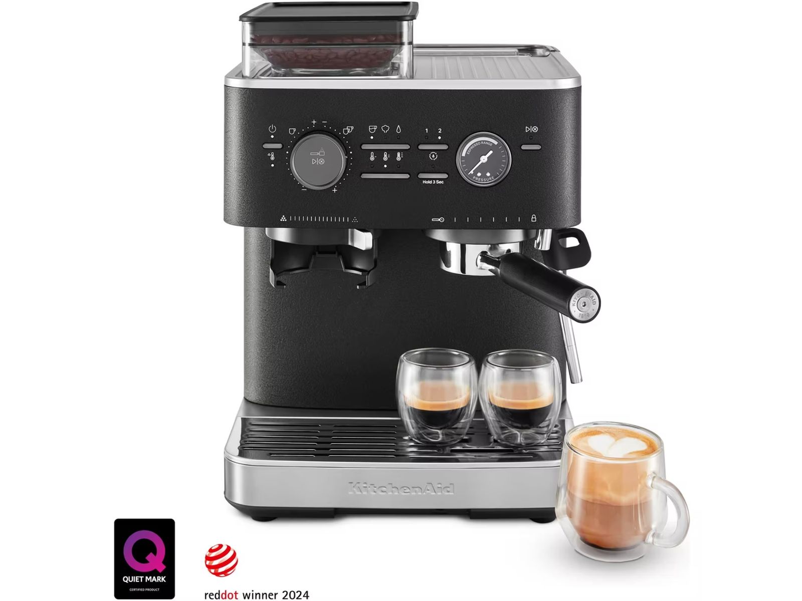 Met de halfautomatische espressomachine van KitchenAid met koffiemolen kun je eenvoudig variëren. Jij bepaalt en maakt al je favoriete espressodranken precies zoals jij ze lekker vindt, van espresso of lungo tot latte, cappuccino en nog veel meer. Met de geïntegreerde conische koffiemolen maal je consistent en er zijn tot wel 15 verschillende maalgraden, van grof tot fijn. Zo vergroot je de smaak van elk kopje. Verwissel bonen, vul ze bij en leeg het bonenreservoir om te genieten van eindeloos veel koffievariëteiten. Dankzij de slimme doseringstechnologie bereid je met één druk op de knop het volume en de consistentie voor 1 of 2 koppen. De eenvoudig aan te stampen filterdrager is 58 mm en ontworpen met verzonken tuiten voor een vlakke basis die aanstampen makkelijker maakt dan bij een traditionele filterdrager van espressomachines voor thuis. Zo geniet je dus altijd van optimale smaak en een rijk cremalaagje. De watertemperatuur pas je eenvoudig naar smaak aan en de krachtige pomp van 15 bar zorgt voor de optimale waterdruk voor een smaakvolle espresso. De espressomachine is Quiet Mark gecertificeerd en heeft 3 jaar garantie.